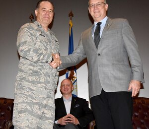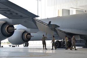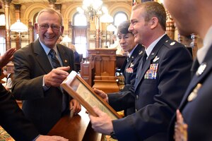 (Right to left) Sen. Dan Goddard, Kansas State Senate District 15, presents Col. Caroline Evernham, 931st Operations Group commander, Lt. Col. Terry McGee, 924th Air Refueling Squadron commander, and Senior Master Sgt. Jay Guldjord, 18th Air Refueling Squadron boom operator, with a plaque detailing