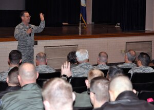Col. Mark S. Larson, 931st Air Refueling Wing commander, asks for a show of hands during a commander's call Jan. 8, 2017, McConnell Air Force Base, Kansas. Larson spoke to Citizen Airmen, relating advice from William Shakespeare's Henry V to upcoming deployments. (U.S. Air Force photo by Senior