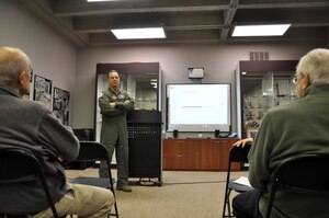 Col. Mark S. Larson, 931st Air Refueling Wing commander, speaks with attendants of "Senior Thursdays," at the Kansas Aviation Museum. During his briefing, Larson discussed the future growth of the 931st, and the layout and features of the KC-46A Pegasus.