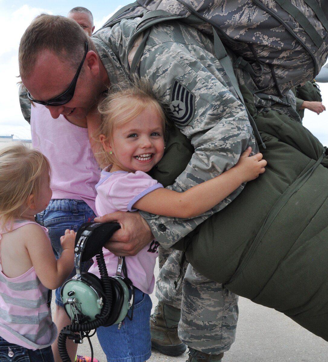 Maj. Daniel Mecham, 18th Air Refueling Squadron pilot, greets his spouse, Michelle, and their sons Dallin and Stephen, after returning from a deployment to Southwest Asia, June 12, 2015, at McConnell Air Force Base, Kan. During the deployment, the 931 ARG performed aircraft maintenance and filled other support roles. (U.S. Air Force photo by Tech. Sgt. Abigail Klein)