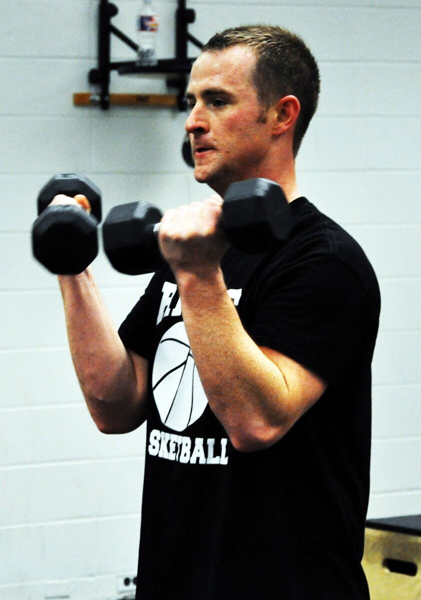 Tech. Sgt. Daniel Mills instructs members of the 18th Air Refueling Squadron as they perform kettlebell squats during a group workout session at the McConnell Air Force Base, Kan., Fitness Center, Feb. 4, 2015. Mills, a refueling boom operator assigned to the 18 ARS, leads daily group workouts for unit members to improve overall fitness and help Airmen stay "fit to fight." (U.S. Air Force photo by Capt. Zach Anderson)