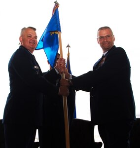 (Left to right) Col. Eric Rivero, 931st Operations Group commander hands the guidon to Lt. Col. Jason Helmick, incoming 905th Air Refueling Squadron commander, Jan. 6, 2024, McConnell Air Force Base, Kansas. Prior to his current assignment, Helmick commanded the 931st Operational Support Squadron.